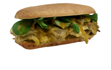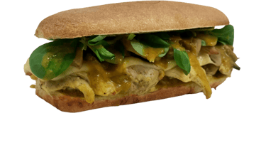 Pollo, emmental, champiñones, espinaca baby y salsa curry